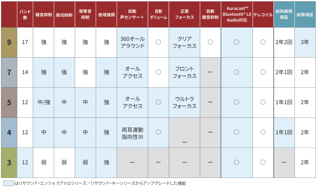 この表はリサウンドの資料から拝借したものです。自動声センサー?360オールアラウンド?オールアクセス?クリアフォーカス、ウルトラフォーカス?何が違うのとなりそうです。当記事ではこの機能の違いはいったん置いておきます。後日別記事で上げる予定です。